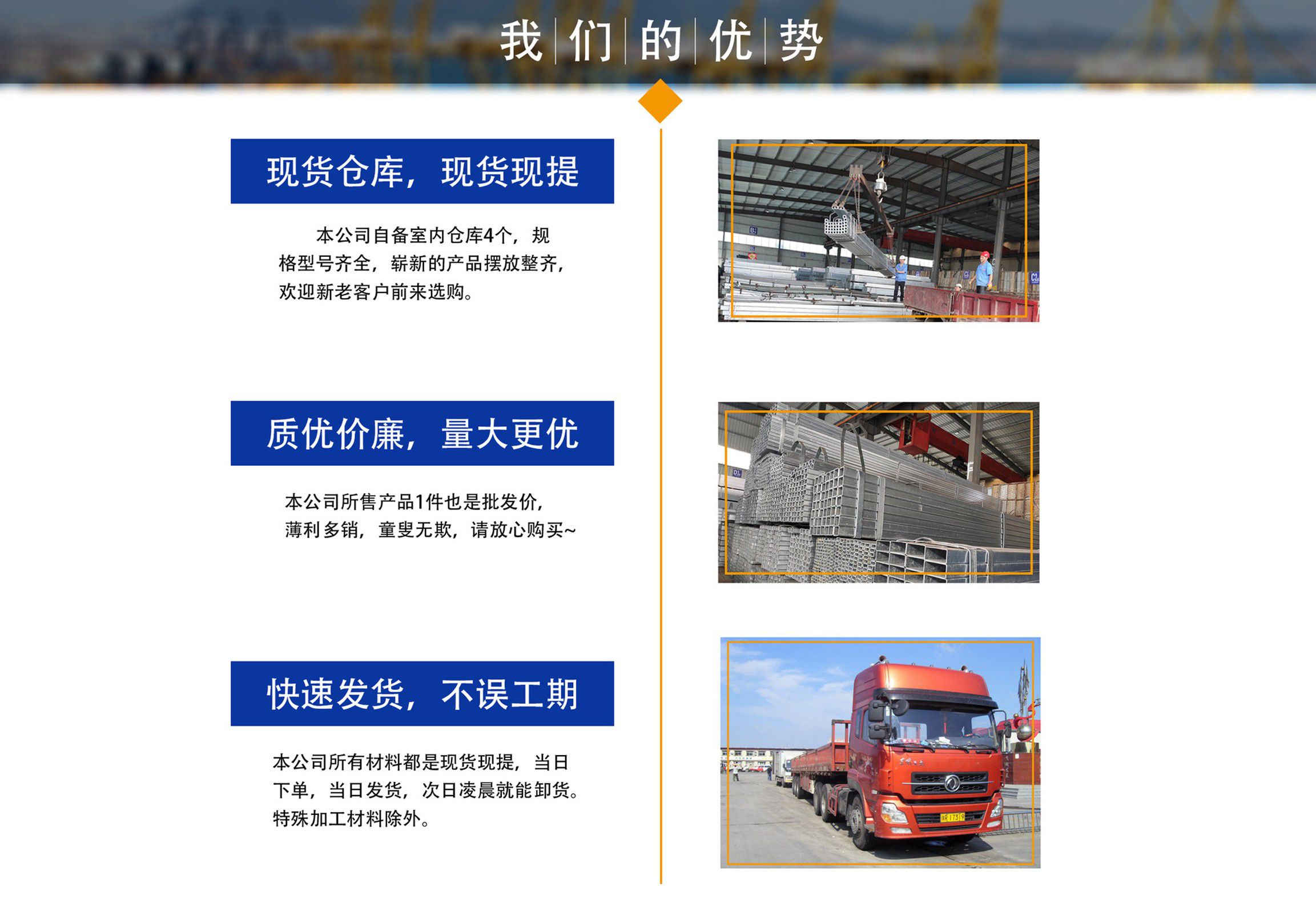 天津鍍鋅方管廠位于天津市靜海大邱莊工業(yè)區(qū),交通便利,地理位置優(yōu)越。我廠占地面積近9000平方米,注冊資金1000萬元,主要從事鍍鋅方管,鍍鋅方矩管,熱鍍鋅方管,鍍鋅方管廠家等產品的生產及銷售,現(xiàn)生產設備已擴大到六條,年生產量十萬噸左右占地面積近兩萬平米。銷售網(wǎng)絡遍及全國,受到廣大用戶認可。公司恪守以誠信為本,立業(yè)為眾的經(jīng)營理念,以可靠的質量、合理的價格、優(yōu)質的服務、卓絕的信譽、期待您的關注和支持。 公司庫存量大,材質規(guī)格齊全,沒有規(guī)格及特殊規(guī)格材質方管可及時定貨生產,我公司經(jīng)營方式靈活,批零兼營、一支起售,并可為客戶辦理鐵路、公路運輸,7*24小時為您服務,歡迎新老客戶來電垂詢。 公司一直堅持“以質量求生存,以產品求發(fā)展,以信譽保合作,以服務贏客戶”的經(jīng)營方針,客戶遍及大江南北,獲得了良好的聲譽與回報,在以后的發(fā)展歷程中,我們愿與廣大客戶攜手并進,共創(chuàng)輝煌。 熱忱歡迎新老客戶蒞臨指導、洽談業(yè)務!...
